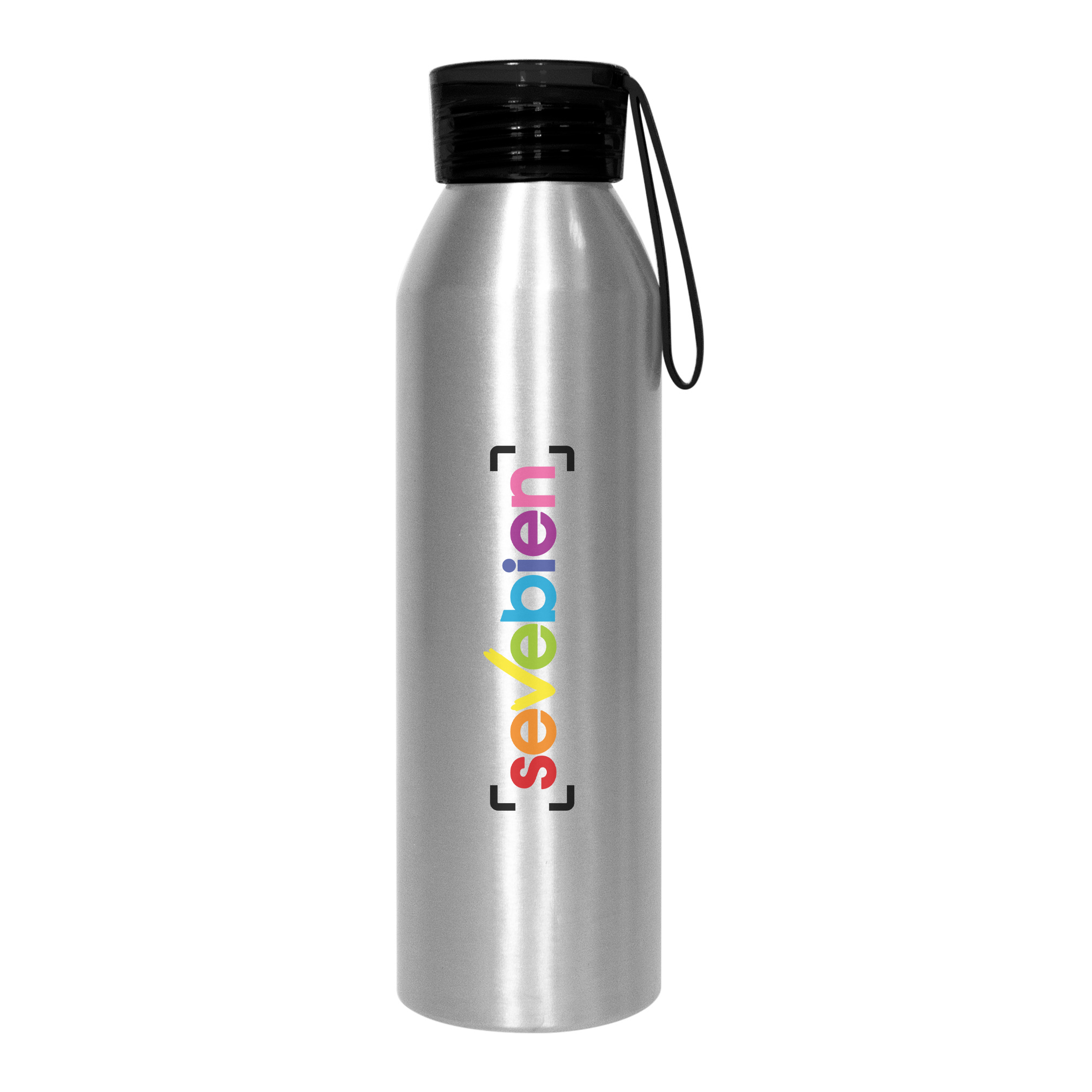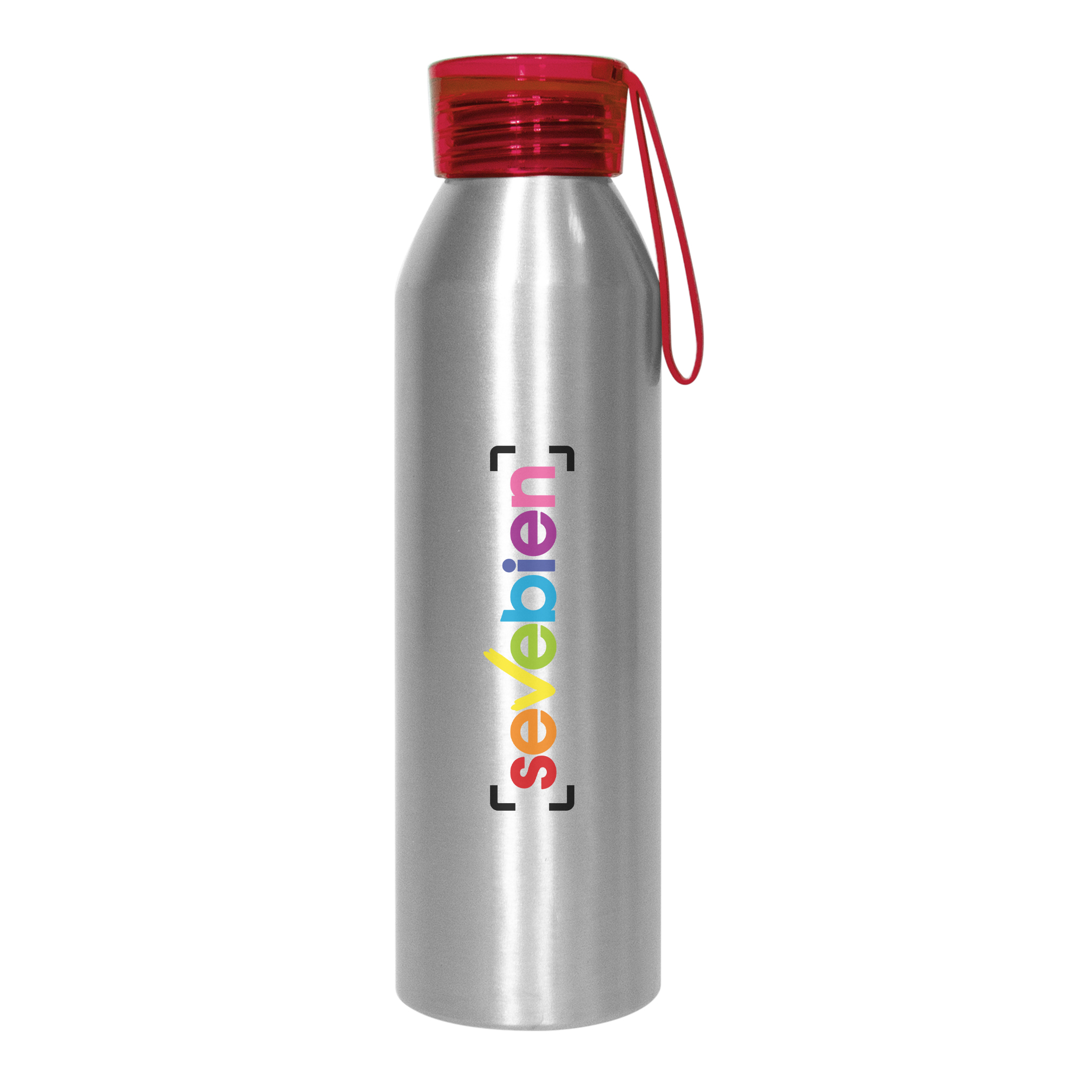 Ø 6,6 x 23 cm. Capacidad 600 ml. Aluminio. Cuerpo color plata, tapa de color traslucida con tira de silicona (de 8 cm) del mismo color. Ideal para hiodratarte todos los dÃas. Presentación en caja de regalo.