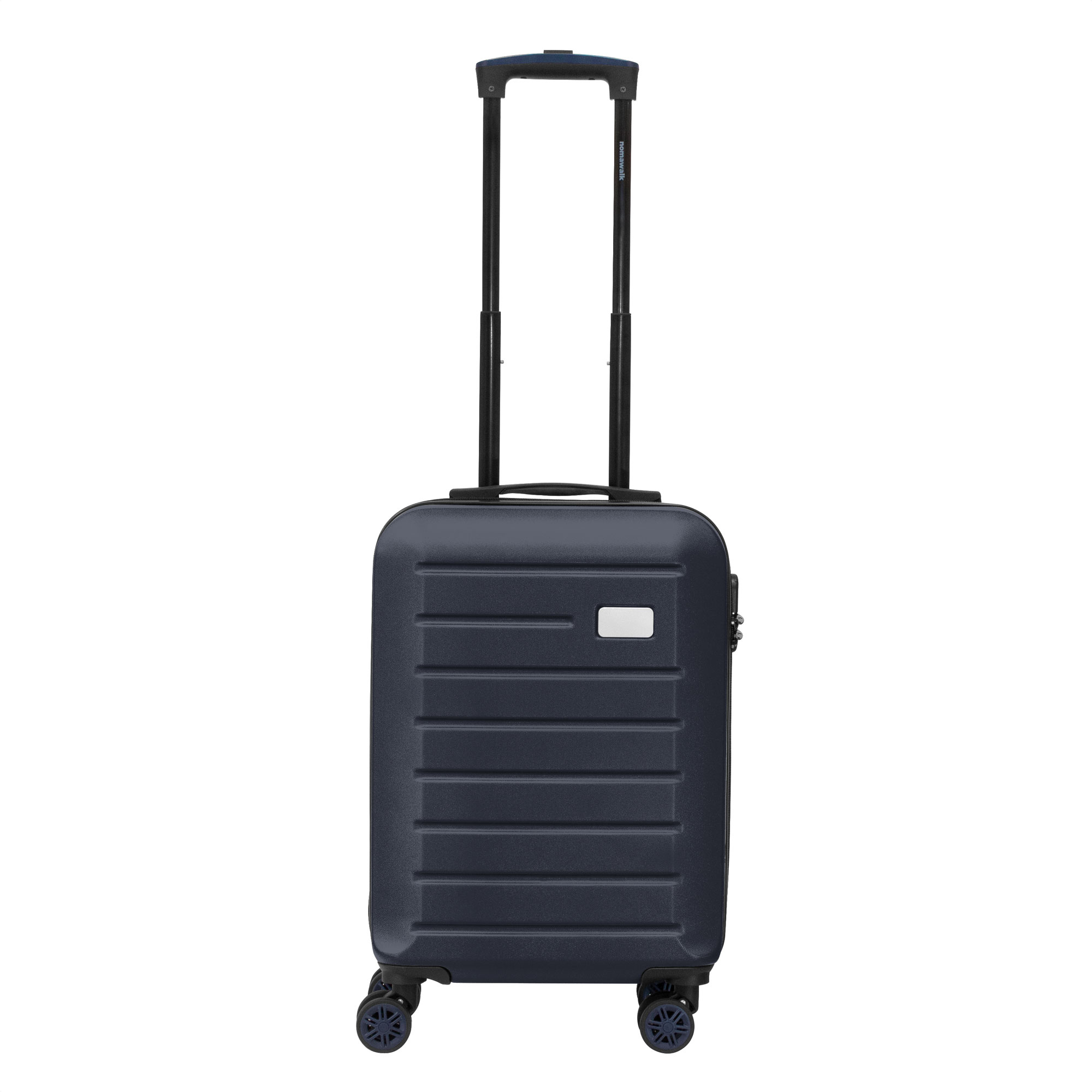 56 x 36 x 20 cm (total). Capacidad 34 litros. Peso aproximado 2,7 kg. 100% ABS. Interior 210D. Valija / Maleta pequeña. 8 ruedas con giro 360°. Manija de transporte reforzada y engomada. Mango extensible hasta 48 cm. 2 posiciones. Interior: 2 compartimentos principales con cierre y elásticos ajustables. Placa metálica desmontable para grabado (medida: 5,3 x 3 cm.) Candado incluido con combinación donde se enganchan los cierres.