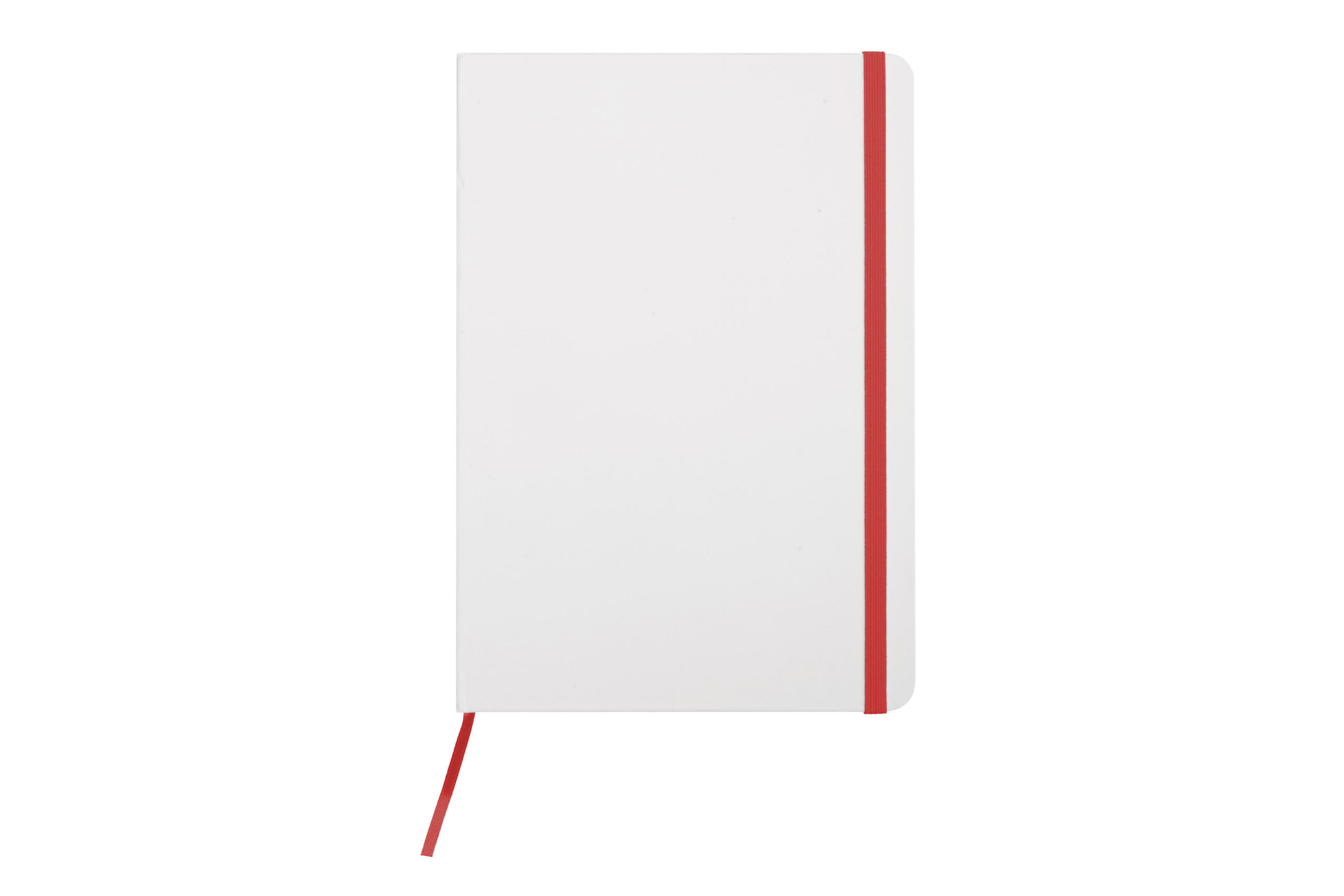 Cartón. 21 x 14,5 x 1,2 cm. Tamaño similar a A5. Libreta de tapa dura color blanco. Contiene 80 hojas rayadas. Posee cierre con banda elástica y separador en tela del mismo color.